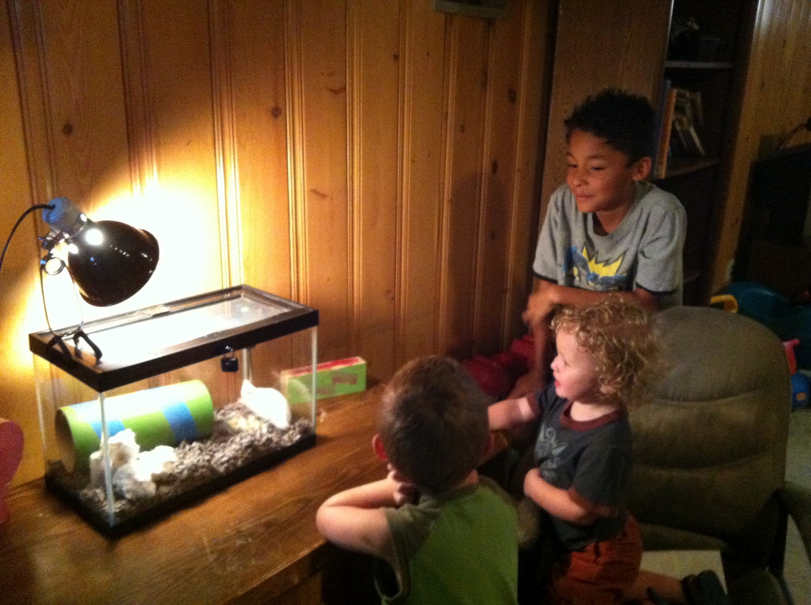 I did something I thought I would NEVER do. I bought rats. Yes RATS! I am surprised how sweet they are and how smart they are! They can learn their names and learn to come to you when you call them along with other simple tricks. We have had them for a week now and so far they haven't bit me or the kids once. They love being held and the boys LOVE them. I wanted to give Avery more responsibility and he is responsible for feeding and cleaning their cage (with my help and supervision of course) and if you can see on the bottom picture I put a lock on the cage so the kids can't go and randomly take one of the rats out of the cage when I am not there. So far Abby (in the first picture) and Sammie (I will take a picture of her later) have been awesome. They are just babies now but we will be getting a bigger cage soon so they can explore more!